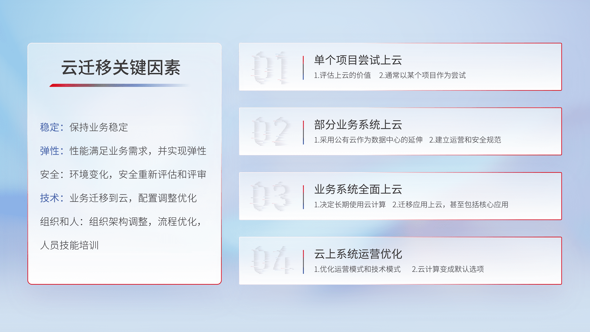 结合实际业务,,从规划设计、、、、云平台选型、、云原生改造、、、、数据迁移、、、、集成交付,,,迁移全过程为客户识别最佳上云路径,,做好风险识别管理,,,,设计网络架构、、、身份权限、、安全审计合规、、、操作审计、、、、日志审计、、、、监控告警策略、、多站点容灾设计等,,对云上基础设施进行整体规划,,,,提升IT治理水平,,以满足弹性、、、高可用、、、高性能的需求。。。。