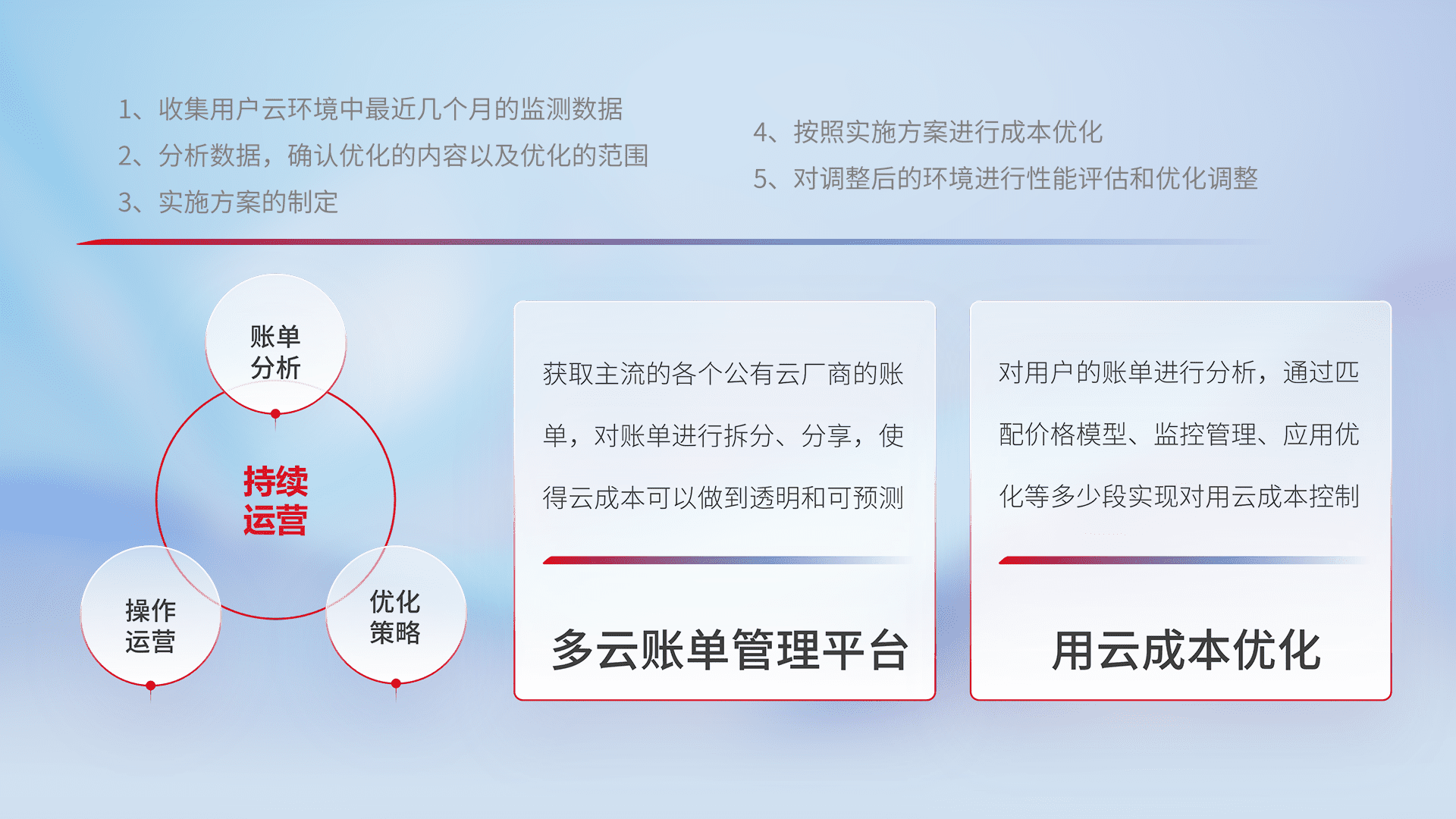 通过灵活运用多种自动化迁移工具,,,帮助企业用户实现业务和数据高效 、、稳定的上云迁移和云上迁移,,,,采用自研多云纳管平台,,以中立管理模式,,,,解决多组织、、、多云、、、多运维厂商的复杂关系的管理,,,保证多云平台资源配置的一致性,,,,实时掌控云资源运行数据,,运用智能化工具分析云资源多云平台的管理服务,,,,透明化管理成本支出,,用云成本可预测、、用云费用可优化、、、、云资源配额有据可依。。。