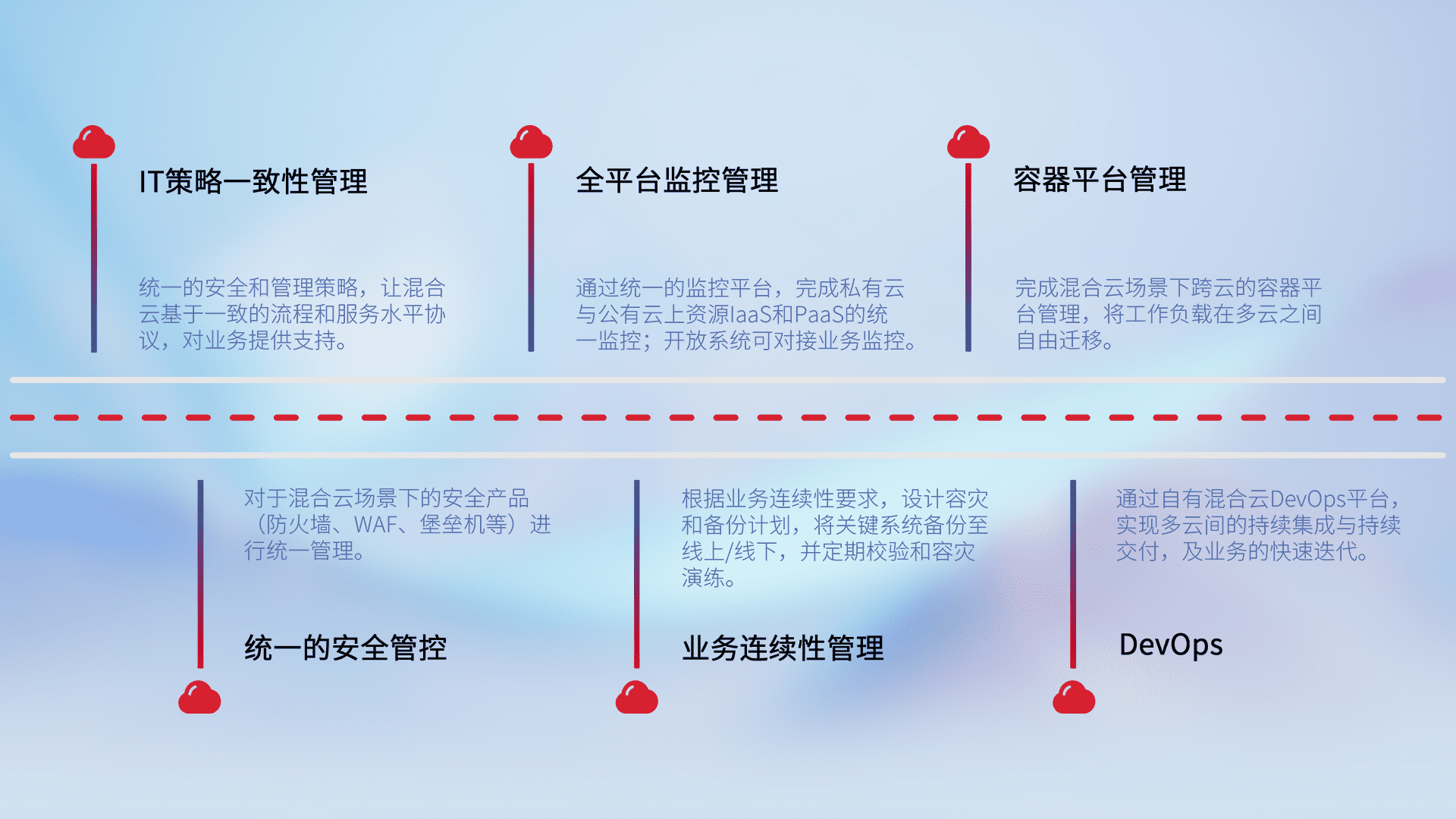 通过多云纳管,,,以统一的资源数据模型把客户的云资源进行抽象和封装,,,,进而实现对多云资源的统一操作,,,,保障云资源管理的可靠性、、、、稳定性与可用性。。。量身定制化运维内容,,配置、、、、开发运维、、补丁管理、、备份、、监控、、认证和访问管理、、、审计和日常巡检等,,保障在用云过程中的可靠度,,稳定度以及高可用率。。