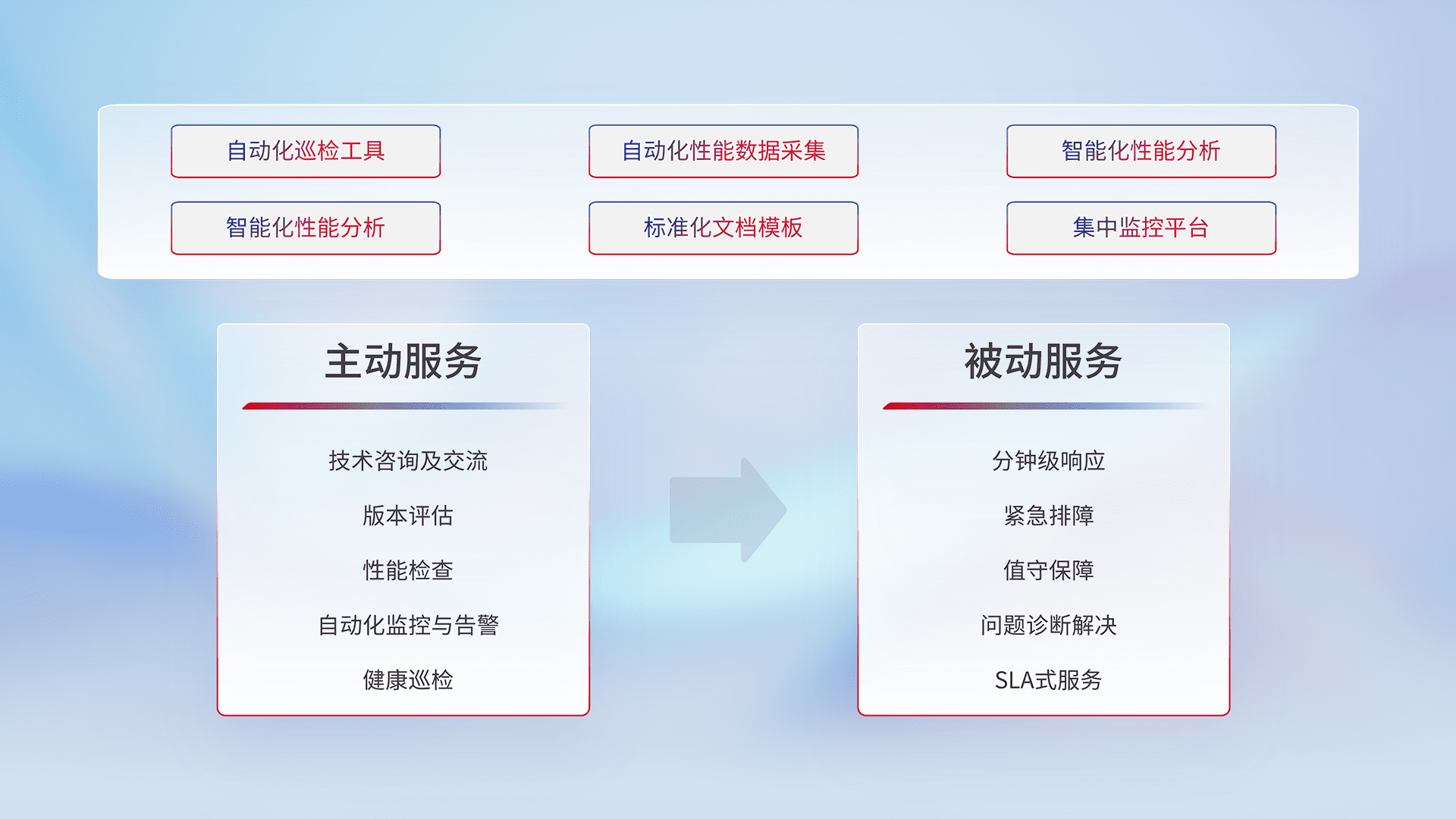 智能化工具和标准化文档,,,,保障服务质量,,,,提供主动服务(包含技术咨询、、、版本评估、、、、性能检查、、、自动化监控与告警、、、、健康巡检)和被动服务包含(分钟级响应、、、、紧急排障、、、值守保障、、问题诊断解决、、、SLA服务)。。